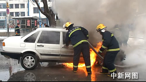 消防官兵趕到現場時煙霧彌漫,車頭蓋不斷有黑煙冒出,駕駛室濃煙滾滾,不時還有紅色火苗噴出。消防官兵用一支水搶直攻火點,用另一支水槍冷確油箱防止油箱爆炸。最終經過5分鐘的撲救火勢被撲滅白車已經被燒成了“黑車”。