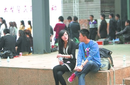 市民吳先生夫婦帶著女兒小倩(化名)和女兒的姨媽一起來到相親現場。4人坐在活動現場后方的草坪上觀看,不時對上場的男士作一番點評。吳先生說,女兒今年22歲,在某民航學院念大四,今年6月份畢業。“她畢業后立志要當空姐,擇婿的標準自然不能低。警察好啊,穩定!”吳先生的妻子說。