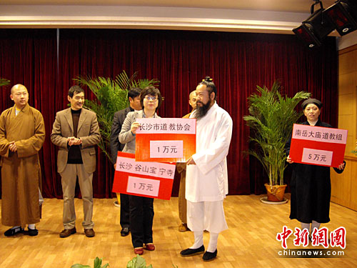 捐款儀式上,湖南省省長助理袁建堯帶頭捐出2000元,隨后湖南省佛教協會、湖南省伊斯蘭教協會、湖南省天主教愛國運動委員會和天主教教務委員會、湖南省基督教“三自”愛國運動委員會和基督教協會、長沙市道教協會、長沙麓山寺、南岳大廟道教組和長沙谷山寶寧寺等單位的代表紛紛走上臺捐款,表達宗教界人士和信教群眾的愛國之情、慈善之心。