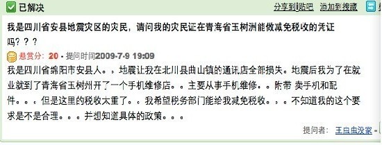 玉樹地震發(fā)生當(dāng)日,一位名叫“王蟲蟲沒家”的網(wǎng)友,因為在去年7月百度知道上發(fā)出的一個帖子被人重新翻起,而成了數(shù)萬網(wǎng)友關(guān)注的焦點。這位網(wǎng)友曾經(jīng)在北川開了一家手機維修店,5.12汶川大地震中北川被震毀,幸存下來的“王蟲蟲”在震后選擇到玉樹州重新創(chuàng)業(yè),并想開一家手機維修店!巴跸x蟲”的這番遭遇,引起了網(wǎng)民的高度關(guān)注,“王蟲蟲”也被網(wǎng)友稱為最悲情的人物。因為“王蟲蟲”最后一次上網(wǎng)登錄的時間已是地震一個月前了,他(她)能否再次躲過這一次天災(zāi),成了眾多網(wǎng)友關(guān)注的焦點。四川在線記者在到達(dá)玉樹后不久,想盡辦法找尋這位網(wǎng)友。