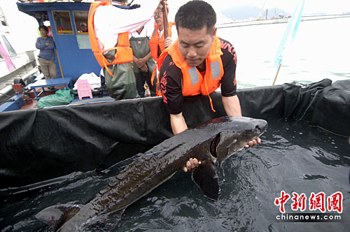 中新社廈門4月22日電 (記者 陳悅)22日下午,廈門在九龍江雞嶼海域放流108尾有“魚類活化石”之稱的中華鱘。其中四只在海洋公園保育基金贊助下,首度配上“衛星追蹤信標”,相關專家表示,這將是中華鱘研究及保育的一大突破,將開展有效保育中華鱘新的一頁。