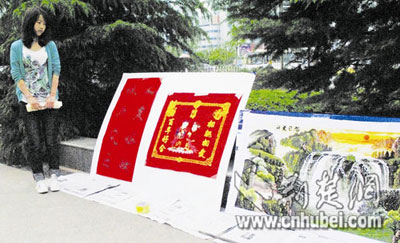 兩個半小時后,當李脈準備返校時,還沒有路人買下她的嫁妝。一名路人說,雖然他認同這名女生的行為,但是一幅十字繡賣幾萬元,太貴。 (楚天金報記者邵娟 大學生記者萬真 通訊員潘子儒)