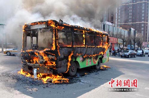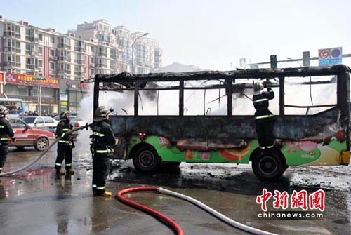 事發時車上大約有20多名乘客,所幸全部安全逃生。消防部門接到報警后,派出兩輛消防車趕到現場。大約30分鐘后,大火被撲滅,但車已被燒成空架。