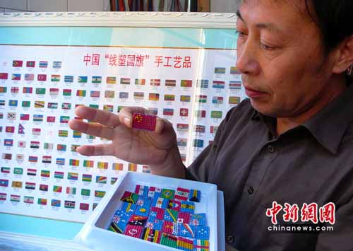 中新網4月30日電(馮文芳)為迎接舉世矚目的上海世博會,山西侯馬工程師郝建安用直徑為0.78毫米的彩色電纜線,制作出方寸大小的世界各國國旗,喜迎上海世博會。他編制的國旗結構緊湊,造型嚴謹,微觀寫意,巧妙夸張,富有立體感。