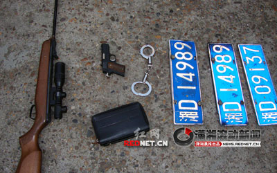 5月11日中午11時許,專門針對從銀行取款后的人實施搶劫的兩名冒牌警察,被衡陽市公安局南岳分局民警抓獲歸案。犯罪嫌疑人作案用的槍支、手銬、小車悉數被警方繳獲。