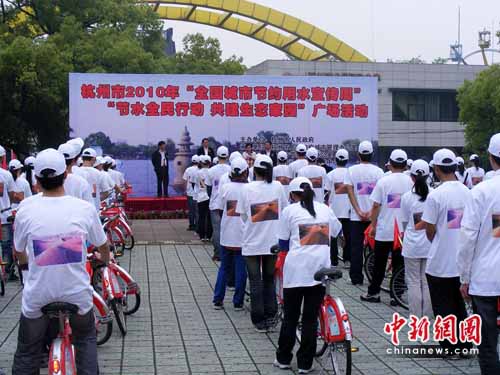 中新網杭州5月15日電(記者 趙曄嬌 實習生 徐進軍)今天,杭州市“全國城市節約用水宣傳周”活動在該市少年宮廣場舉行,由近五十名大學生組成的節水志愿者車隊騎著公共自行車環繞西湖,倡導“節水減排,綠色出行”,提高市民低碳意識。據悉,杭州水資源緊缺的矛盾日益嚴峻,僅去年末總蓄水量就較2008年同期減少10.14億立方米,相當于減少近100個西湖的水量。