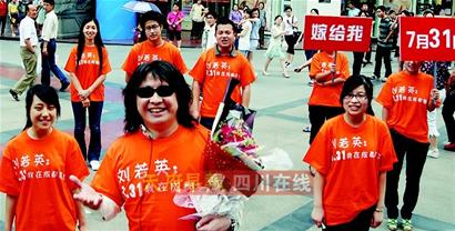 下午3時,春熙路口出現一群身著橘色T恤衫的年輕人,T恤上印有“支持奶茶哥,7·31我在成都等你”等字樣。他們迅速排成一個“心”形隊列,手舉紅色的口號牌大喊:“劉若英,嫁給‘奶茶哥’吧!”“眼尖”的市民立馬就認出了站在隊伍最前面的“莫扎特趙”,就是現在廣為成都市民所熟知的“奶茶哥”。“奶茶哥”戴著墨鏡,身穿橘色T恤、白色休閑褲,手上捧著一大束玫瑰花,看起來心情不錯。