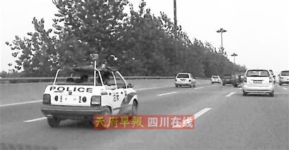 網友“雙魚情史”在論壇上傳了數張自己日前在馬路上拍攝的“敞篷版”拓拓圖片,圖片中的奧拓車可謂一個“牛”字:沒有車牌,除了擋風玻璃外,四扇玻璃和車頂都已卸去,車身印有如警車一樣的警盾標識,該車還正在馬路上飛馳。“雙魚情史”發文說,當時這輛車正在川藏立交上行駛,無牌、無頂、警識、拉風,全占齊嘍,的確霸道。