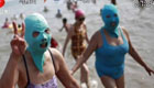 海邊戲水要防曬 女子頭戴尼龍面罩