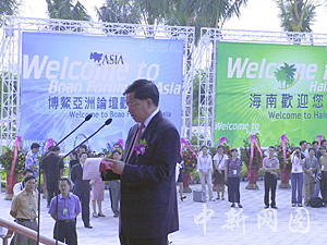 由中遠集團投資建設的博鰲亞洲論壇永久會址——博鰲亞洲論壇國際會議中心二十二日揭幕,博鰲亞洲論壇秘書長龍永圖在揭幕典禮上致詞。中新社記者 關向東 攝