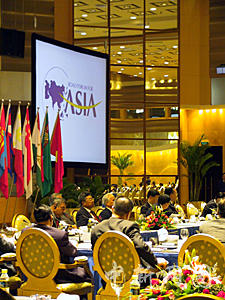 前來參加博鰲亞洲論壇永久會址揭幕典禮的代表,二十二日在新落成的會議中心舉辦博鰲亞洲論壇回顧與展望園桌會議。中新社記者 關向東 攝