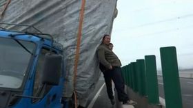 實拍:兄弟倆用雙肩力扛傾斜大貨車