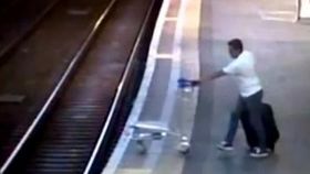 監(jiān)拍男子將小車推入軌道逼停火車驚險一幕