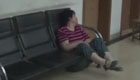 實拍女子發力過猛坐穿鋼椅 體態臃腫被困待救