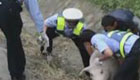 實拍:兩頭肥豬高速逃脫 七名交警費力捕捉