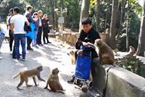 貴州黔靈山猴子“成精” 直“抱”游客大腿要食物