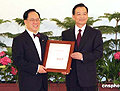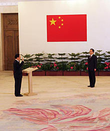 6月24日上午9時(shí),香港特區(qū)行政長官曾蔭權(quán)就職儀式在人民大會堂香港廳舉行。曾蔭權(quán)向溫家寶總理宣誓就職。溫家寶總理向曾蔭權(quán)頒發(fā)了中央人民政府任命書