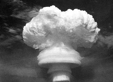氫彈爆炸時,作為引爆裝置的原子彈首先爆炸,產生數千萬度高溫,促使氘氚等輕核急劇聚變,放出巨大能量,形成更猛烈的爆炸。