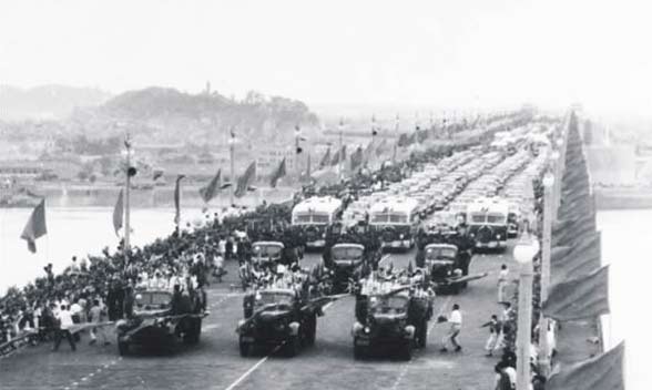 中國(guó)第一座跨越長(zhǎng)江的大橋——武漢長(zhǎng)江大橋由國(guó)務(wù)院于1955年7月18日批準(zhǔn)技術(shù)設(shè)計(jì)方案、大橋的施工進(jìn)度計(jì)劃和總預(yù)算,1955年9月正式開工,至1957年9月25日完工,并于10月15日正式通車。它是一座雙軌雙層的兩用橋,下層鋪著可同時(shí)對(duì)開兩列火車的雙軌鐵路,上層的公路橋可并行六輛汽車,橋下可航行輪船。