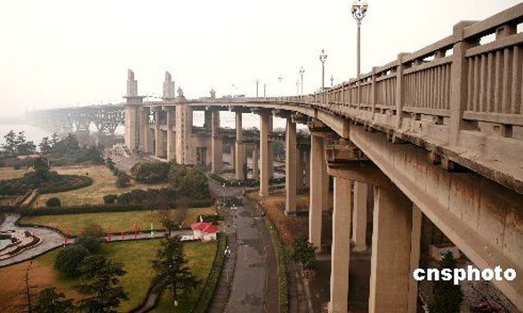 南京長江大橋江中正橋共有9墩10孔,每個橋墩高80米,每墩底部面積400多平方米,比一個籃球場還大,最高的橋墩從基礎到頂部高85米。墩與墩之間的距離除北岸第一孔是128米外,其余9孔均為160米,橋下可行萬噸巨輪。正橋兩端有4座70多米高的橋頭堡。整座大橋如彩虹凌空江上,巖床埋在正橋河床33~47米以下,9個橋墩基礎分別采用重型混凝土沉井、鋼沉井加管柱、浮式鋼筋混凝土沉井、鋼板樁圍堰管柱等基礎。正橋10孔鋼筋梁中9孔為160米跨度,采用優質合金鋼桿件在現場鉚接拼裝架設。