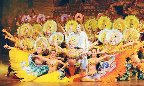 《絲路花雨》是以舉世聞名的絲綢之路和敦煌壁畫為素材創(chuàng)作的大型民族舞劇。它歌頌了畫工神筆張和歌伎英娘的光輝藝術(shù)形象,描寫了他們的悲歡離合以及與波斯商人伊努斯之間的純潔友誼。《絲路花雨》自1979年首演至今,共演出1400余場,觀眾達(dá)300多萬人次,2004年10月被上海大世界基尼斯總部認(rèn)定為“中國舞劇之最”。多年來,《絲路花雨》先后訪問過朝鮮、法國、意大利、日本、泰國、前蘇聯(lián)、西班牙、土耳其及港澳臺(tái)等20多個(gè)國家和地區(qū),演出深受好評(píng),被譽(yù)為“中國民族舞劇的典范”。