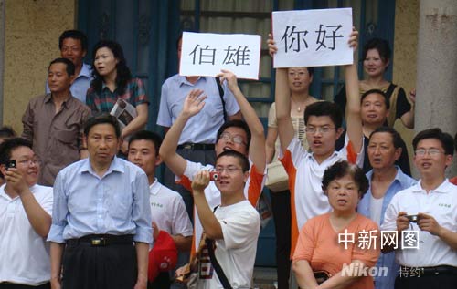 大學生在中山陵迎候吳伯雄 打出"伯雄你好"標語