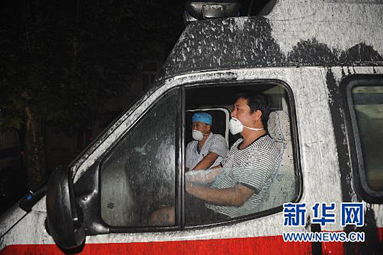 圖:大連新港輸油管道爆炸起火 救護人員在事故現場