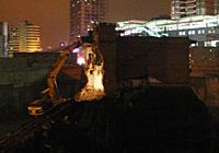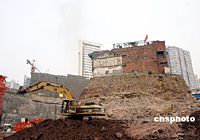 挖土機在未拆遷的小樓旁工作