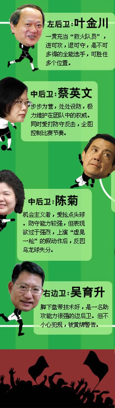 2009年大幕即將落下,臺灣政壇照舊精彩紛呈,多路人馬粉墨登場。在這個情節跌宕起伏、堪比“足球甲級聯賽”的舞臺上,眾“球員”充分展示出個人技術和力量。中新網特別從各支“參賽隊伍”中精挑細選,組成“本年度全明星陣容”,藉此梳理臺灣政壇發生的那些人和事,以饗諸位“球迷”。