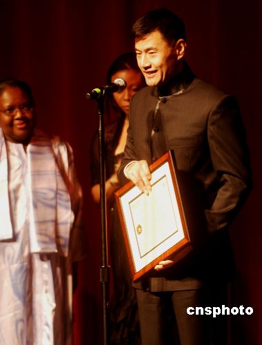 中美電影節(jié)十一月一日晚在好萊塢美國導(dǎo)演公會開幕,聯(lián)合國兒童機構(gòu)一個協(xié)會特意向中國影星于榮光頒發(fā)和平發(fā)展親善大使證書。中新社發(fā) 賈國榮 攝