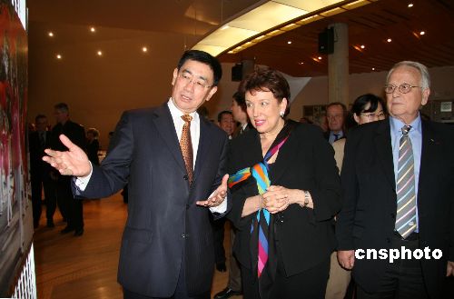 11月7日晚,由中國駐法使館和法國奧委會共同主辦的“北京歡迎您”迎奧運圖片展,在巴黎法國奧委會總部、法蘭西運動之家隆重開幕。旅法華人社團僑領等各界人士約400人出席了開幕儀式。圖為中國駐法大使趙進軍和法國衛生、青年與體育部長巴舍洛-納爾坎女士,法國奧委會主席塞朗杜爾參觀圖片展。中新社發 鐘誠 攝