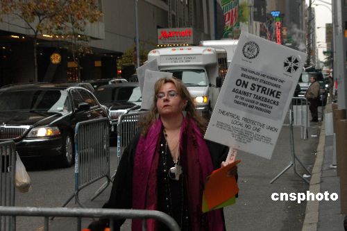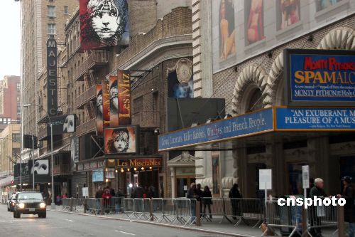 當?shù)貢r間十一月十二日的紐約百老匯街在罷工中榮景不再、一片蕭條。紐約舞臺工作人員工會與舞臺劇制作人聯(lián)盟之間的談判至周一仍然處于僵持狀態(tài),舞臺工作人員繼續(xù)罷工,目前罷工抗議活動已經(jīng)進入第三天,這使百老匯包括《獅子王》、《歌劇魅影》等在內(nèi)的27個舞臺劇被迫停演。罷工導致每日損失在一千七百萬美元以上。中新社發(fā) 劉小青 攝