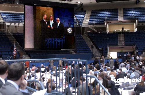 各方關(guān)注的中東和會(huì)當(dāng)?shù)貢r(shí)間十一月二十七日十一時(shí)在美國馬里蘭州安那波利斯的美國海軍學(xué)院開幕。在美國總統(tǒng)布什的主持下,巴勒斯坦民族權(quán)力機(jī)構(gòu)主席阿巴斯和以色列總理奧爾默特的雙手緊緊握在一起,現(xiàn)場響起了熱烈的掌聲。中新社發(fā) 邱江波 攝