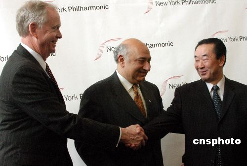 紐約當地時間十二月十一日,世界著名樂團紐約愛樂樂團正式宣布二00八年二月訪問朝鮮,在平壤舉辦音樂會。當日,朝鮮常駐聯合國代表樸吉淵出席有關新聞發布會時表示,他深信此舉將有助于朝美之間加強文化關系,增進兩國人民的相互理解。圖為紐約愛樂樂團主席保羅‧庫恩達(左)、團長扎林·梅塔(中)和樸吉淵在發布會后握手互祝訪問成功。中新社發 李靜 攝