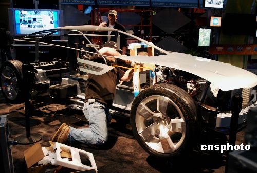 美國通用汽車一月六日在拉斯維加斯世界最大的消費電子產品展上,展示環保型無排放汽車模型。中新社發 賈國榮 攝