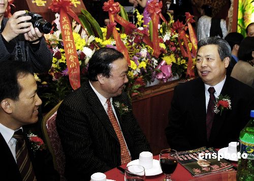 當(dāng)?shù)貢r間一月八日晚,中國駐紐約總領(lǐng)事館總領(lǐng)事彭克玉大使(右)在紐約曼哈頓華埠美東僑界為他舉辦的歡迎晚宴上與華聯(lián)總會共同主席梁冠軍(左)和陳清泉(中)親切交談。中新社發(fā) 鄧悅 攝