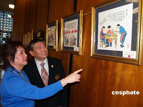 2008年1月9日,華人聚集的洛杉磯阿罕伯拉市舉行中國(guó)年畫(huà)拍賣會(huì),為阿罕伯拉市高中籌集教育基金。成都女畫(huà)家陳雪梅的12幅鼠年年畫(huà),為美國(guó)中學(xué)生籌得近5000美金。阿罕伯拉市華裔市長(zhǎng)沈時(shí)康、拍賣活動(dòng)負(fù)責(zé)人陳惠萍欣賞中國(guó)年畫(huà)。中新社發(fā) 盧威 攝