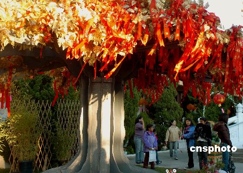美國洛杉磯華人華僑在中國農歷新年紛紛到寺院逛廟會,在黃金樹下投擲鼠年許愿的紅飄帶。中新社發 賈國榮 攝