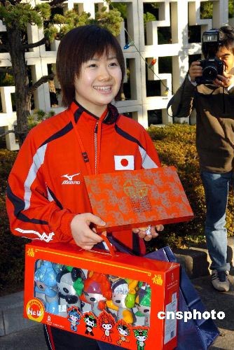 2月18日下午,日本著名乒乓球運動員福原愛來到中國駐日本大使館,拜會崔天凱大使。崔大使及夫人在使館官邸熱情接待了這位深受中日兩國球迷喜愛的“瓷娃娃”,并與其交換了禮物。圖為福原愛走出大使官邸后興高采烈的向前來采訪的記者展示崔大使贈送給她的奧運福娃和中國印有自己名字的筷子。中新社發 滕劍峰 攝