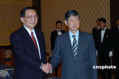 2月21日下午,正在日本進行正式訪問的中國國務委員唐家璇在東京飯倉公館會見了日本外相高村正彥(右)。中新社發 滕劍峰 攝