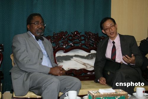 當?shù)貢r間24日下午,聯(lián)合國-非盟達爾富爾維和行動聯(lián)合特別代表阿達達(左)在中國駐蘇丹使館,會見到訪蘇丹的中國政府達爾富爾問題特別代表劉貴今。中新社發(fā) 李鵬 攝