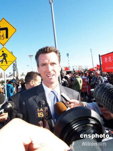 4月9日,舊金山市長紐森在華人華僑和中國留學生迎圣火隊伍前被媒體包圍采訪。中新社發 盧威 攝