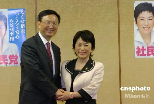 4月18日上午,外交部長楊潔篪在東京社民黨總部會見了日本社民黨黨首福島瑞穗女士。福島瑞穗女士對楊潔篪部長的來訪表示熱烈歡迎,并祝愿繼韓國漢城奧運會之后時隔20年再次在亞洲舉辦的北京奧運會取得圓滿成功。中新社發 朱沿華 攝