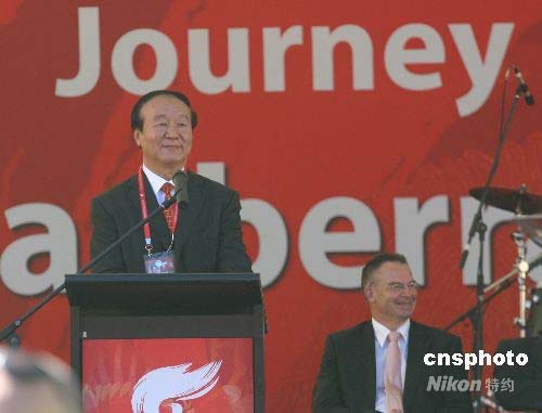 4月24日中午11時35分,北京奧運圣火在澳大利亞首都堪培拉的傳遞順利結束。北京奧運圣火在堪培拉的傳遞從和解廣場開始后,途經戰爭紀念館、高等法院、國家圖書館、國會大廈等地,最終于中午12時左右在聯邦公園點燃圣火盆并舉行慶典儀式。堪培拉傳遞路線全長約15公里,80位火炬手,平均每人傳遞190米左右。圖為北京奧組委執行副主席蔣效愚(左)在慶典儀式上致辭。