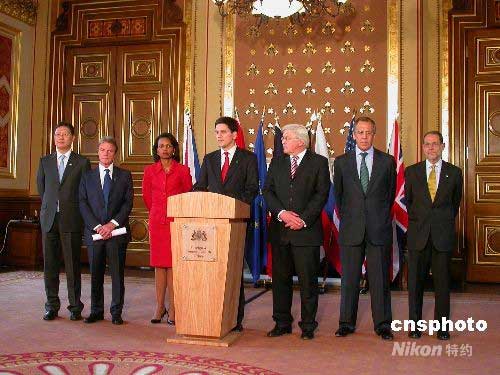 當地時間2日下午,伊朗核問題六國外長會議在倫敦舉行,就伊核問題復談方案達成一致,決定盡快向伊朗送交。中國外交部部長助理何亞非作為楊潔篪外長代表出席會議。圖從左至右分別為:何亞非、法國外長庫什內、美國國務卿賴斯、英國外交大臣米利班德、德國外長施泰因邁爾、俄羅斯外長拉夫羅夫、歐盟共同外交與安全政策高級代表索拉納。中新社發 攝