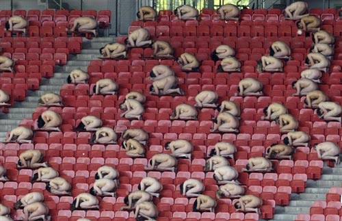 5月11日,在奧地利維也納恩斯特-哈佩爾體育場,1800多名奧地利裸體志愿者為美國攝影師斯賓塞-圖尼克(著名裸體攝影師)擺造型。圖尼克準(zhǔn)備在一座體育場內(nèi)集合2008名裸體志愿者進(jìn)行拍照,為即將開幕的08年足球歐錦賽添彩。