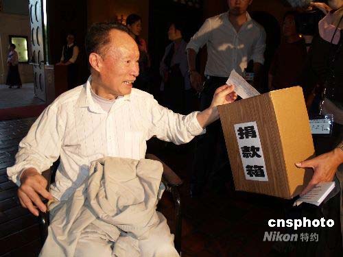 5月15日,美國五洲電視臺在洛杉磯舉辦“南加州為四川賑災義演晚會”,南加州華人聯合總會、南加州大西南同鄉會等一百多僑團近千人積極參加。會上,華人華僑紛紛解囊支援四川災區,并觀看了四川賑災的電視新聞片及文藝節目。圖為癱瘓臥床已12年的華裔老人周紹寬在女兒陪伴下坐著輪椅親手將錢投入“捐款箱”。中新社發 盧威 攝