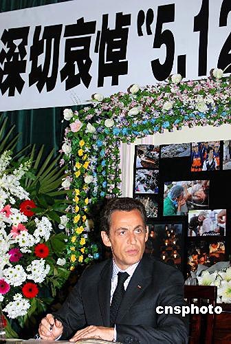 巴黎時間五月十九日下午,法國總統薩科奇來到中國駐法國大使館,對中國四川汶川地震遇難者表示深切哀悼。圖為薩科奇在留言簿上留言。中新社發 吳衛中 攝