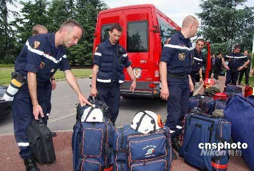 一支由十三名急救醫生、護士和醫療輔助人員組成法國醫療隊當地時間5月24日下午從巴黎啟程,飛赴中國,幫助治療汶川大地震中的傷員。圖為醫療隊成員在巴黎戴高樂機場整裝待發。中新社發 吳衛中 攝