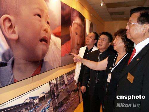 6月14日,“中國汶川大地震圖片巡回展”在美國洛杉磯舉行,共展出活靈活現(xiàn)四川受震悲慘鏡頭及災(zāi)民奮勇抗災(zāi)的難忘畫面共120多幅珍貴照片,圖片巡回展旨在“感動美國,救援災(zāi)區(qū)”。圖右起蒙特利公園市議員劉達強、世界華人華僑總會副主席姜華等被一張“地震中的小男孩”照片所吸引。中新社發(fā) 盧威 攝